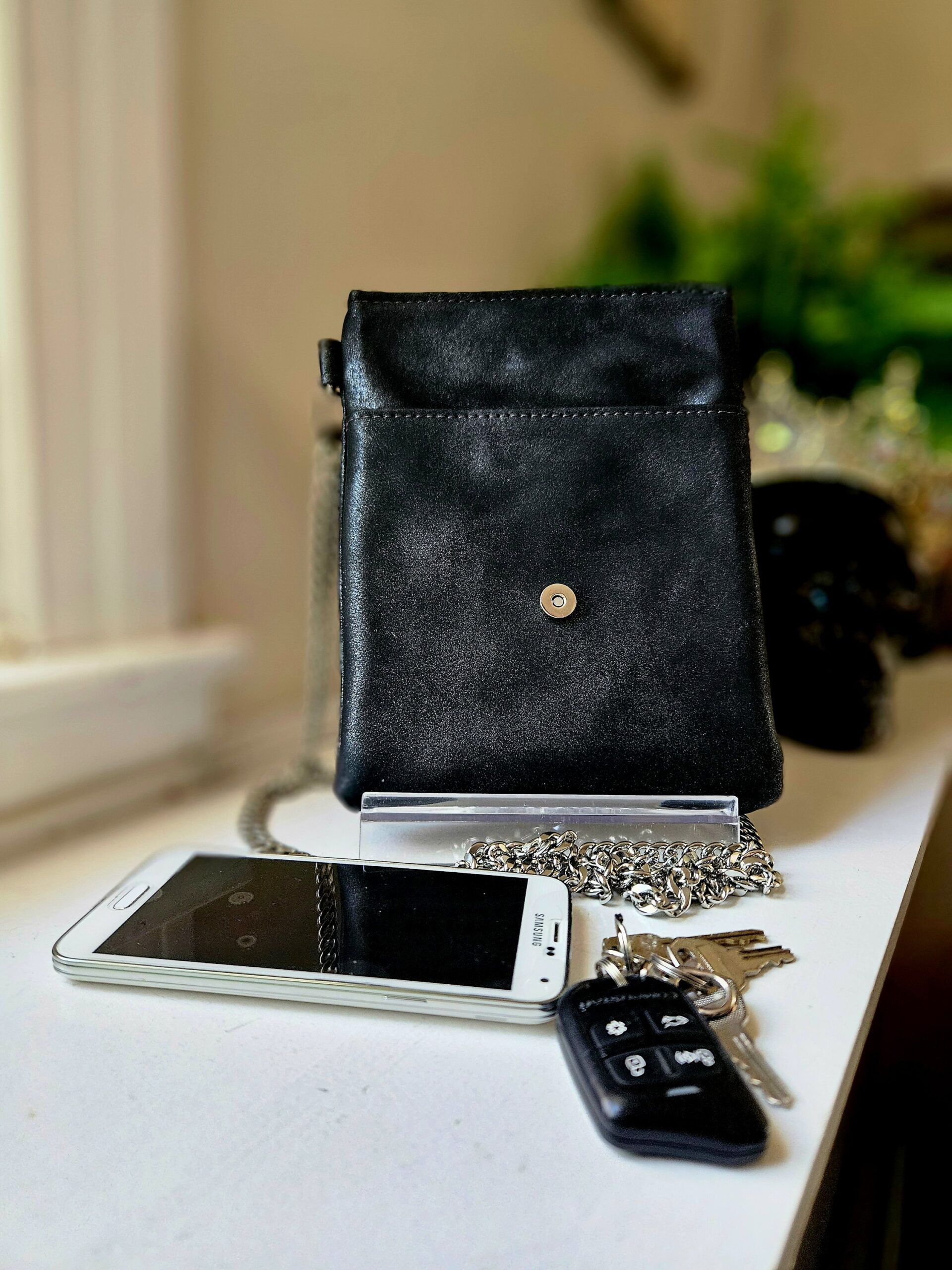 Chain strap can be changed for a black vinyl strap